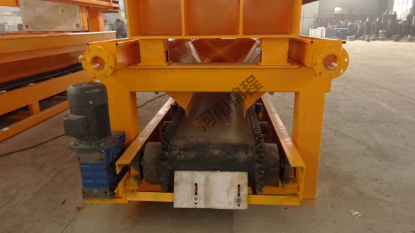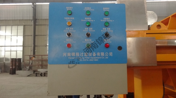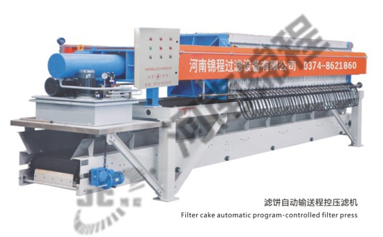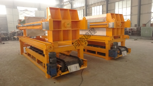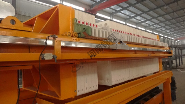 在液壓缸的作用下,壓濾機濾板沿主梁移動壓緊,使相鄰濾板間形成濾室,周邊密封。煤泥水經(jīng)人料泵以一定壓力從人料孔給人各濾室,借助人料泵的給料壓力在過濾介質(zhì)兩側(cè)形成的壓力差實現(xiàn)固液分離,煤泥顆粒滯留在濾室內(nèi),濾液透過過濾介質(zhì)從濾板的導水孔排出機外。經(jīng)過一段時間后,濾液不再流出,過濾脫水過程完成。停止入料,由鏈條拉開濾板,濾餅脫落后,由壓濾機下的刮板輸送機或膠帶機運走。